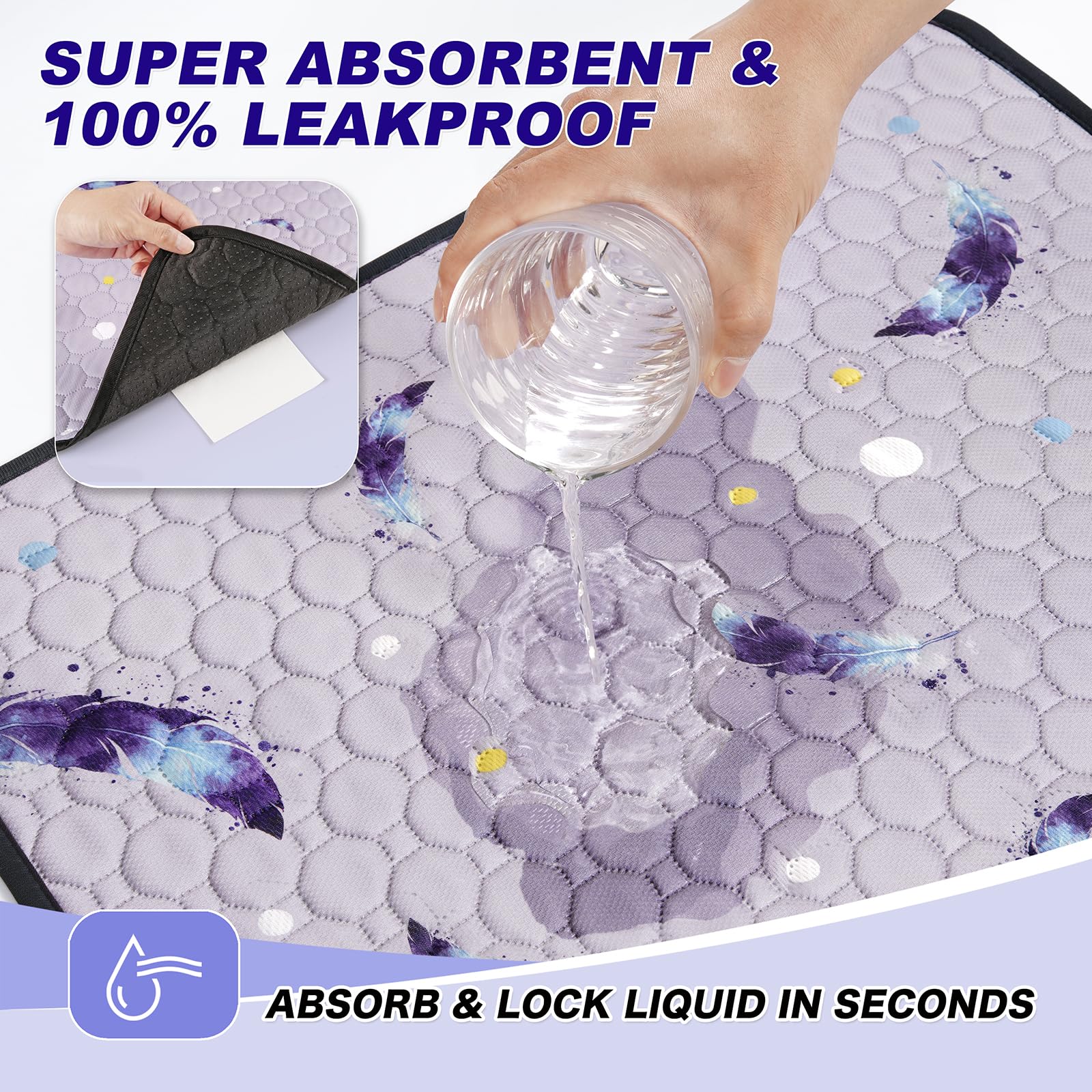 - Super Absorbent & Leakproof Design: These washable pee pads for dogs are crafted with high-density materials, featuring a polyester knitting surface for ultimate comfort. The superior absorbent cotton middle layer ensures your pet's surfaces stay dry, while the breathable waterproof PUL inner layer provides full protection against urine leakage. Perfect for puppies, older dogs, and pets with incontinence issues.